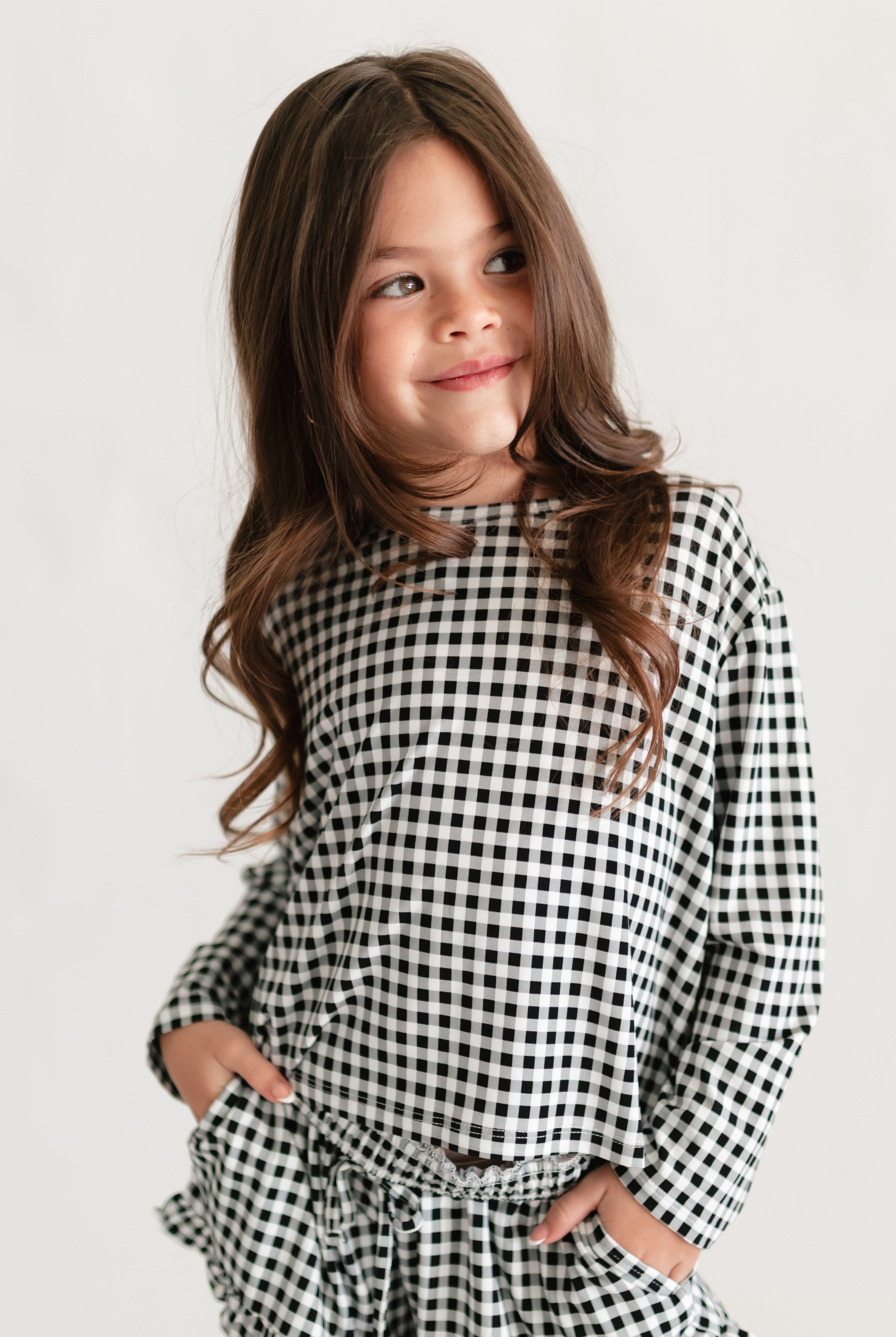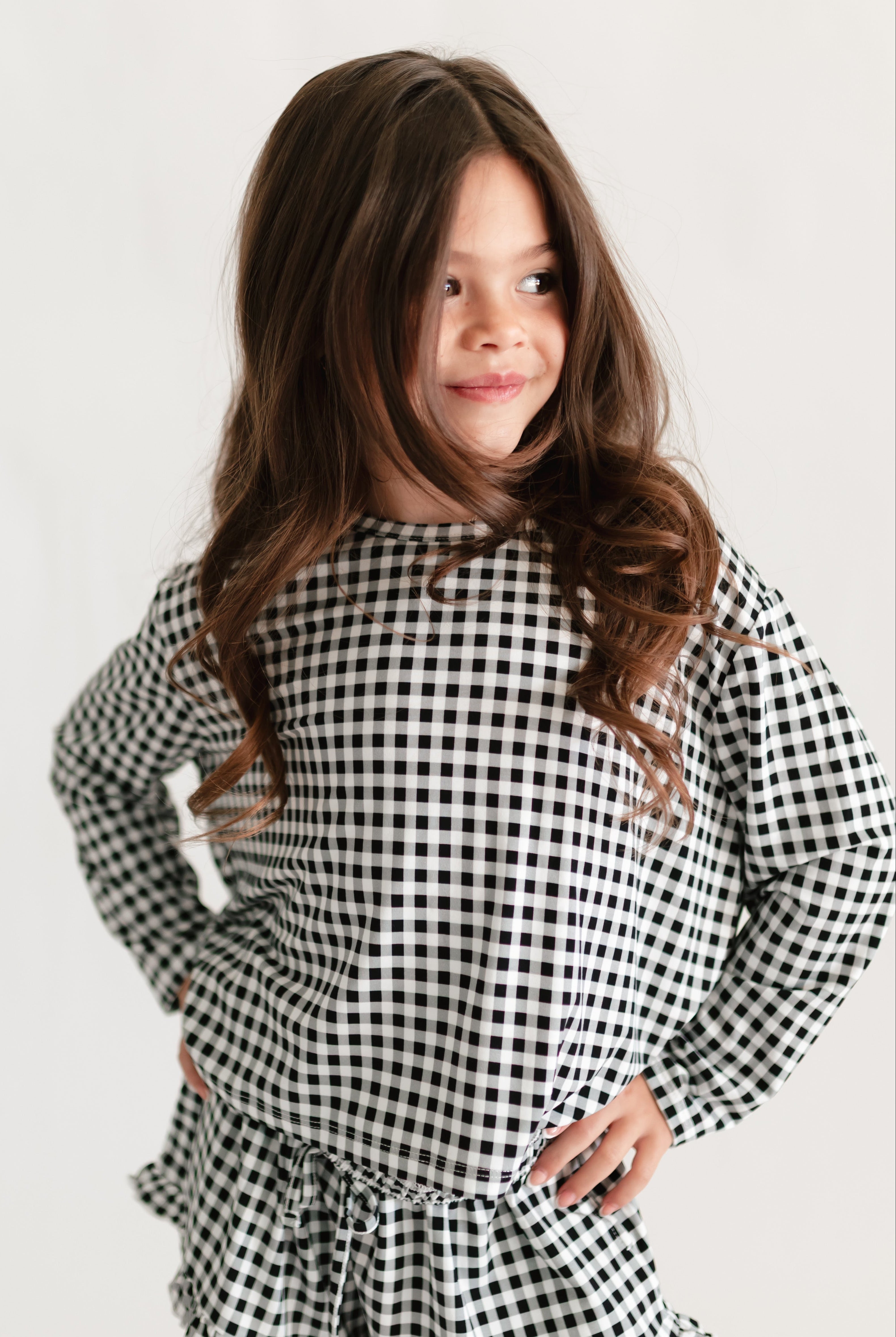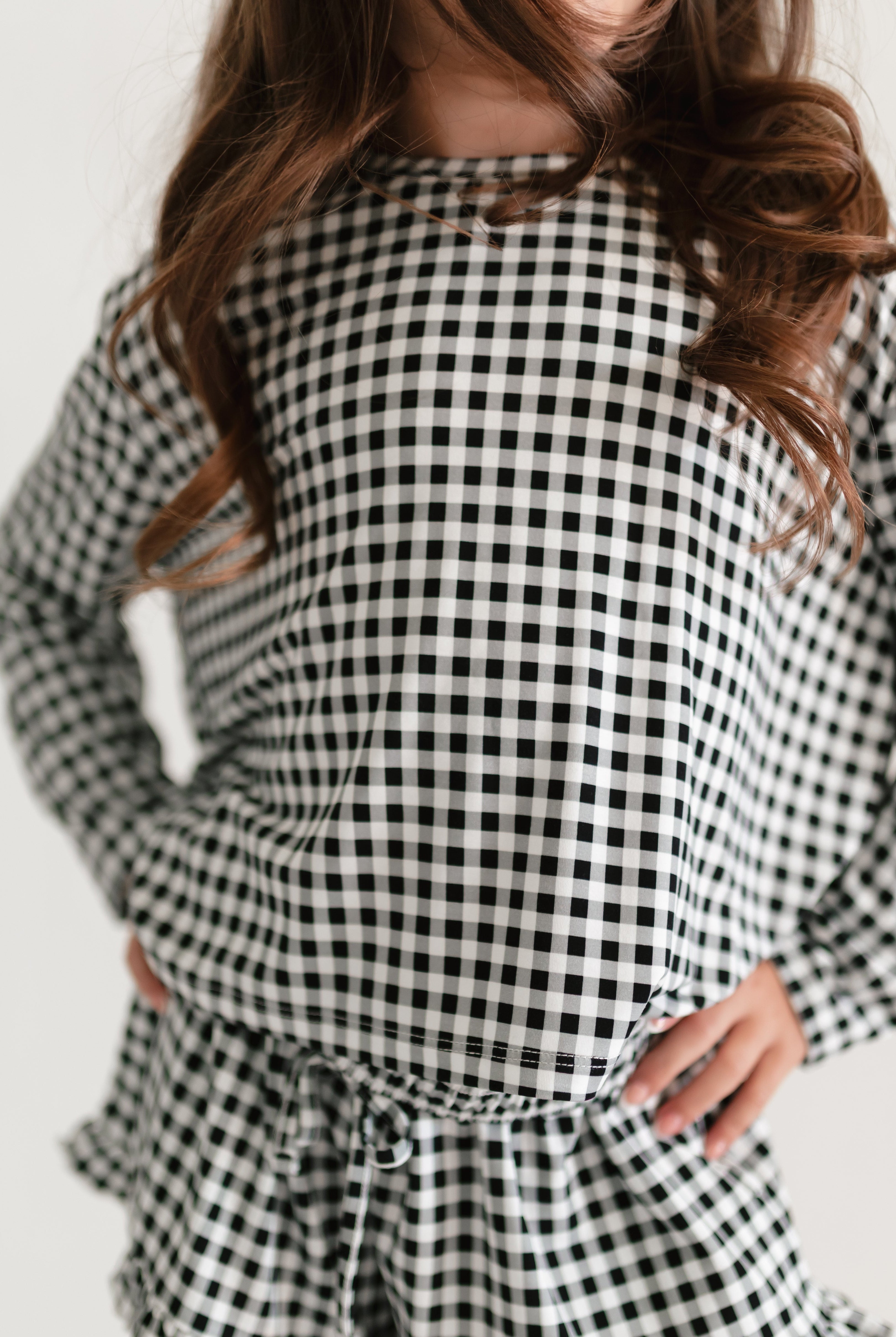 Girl's Long Sleeve and Ruffle Shorts Set in Black Gingham