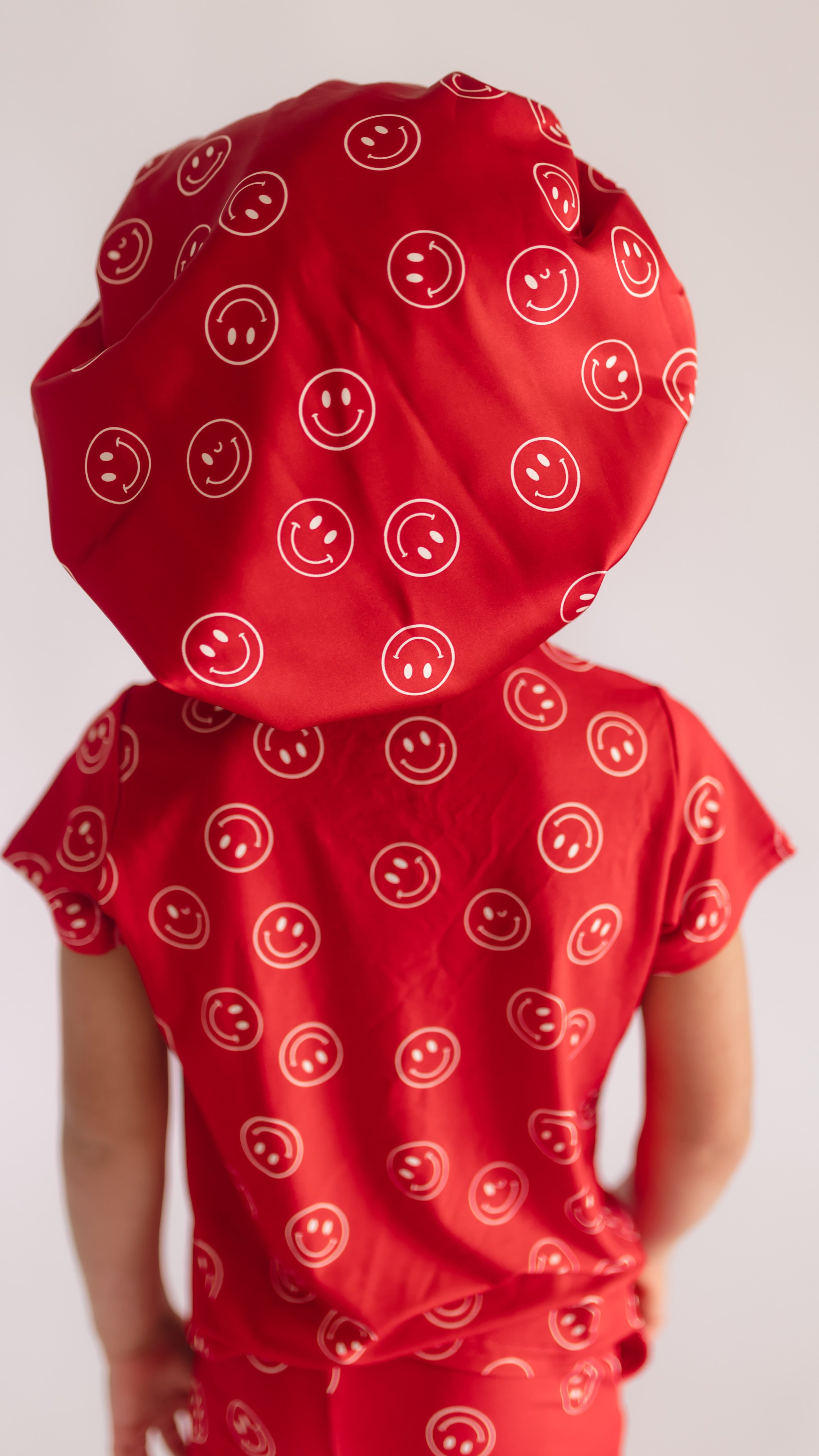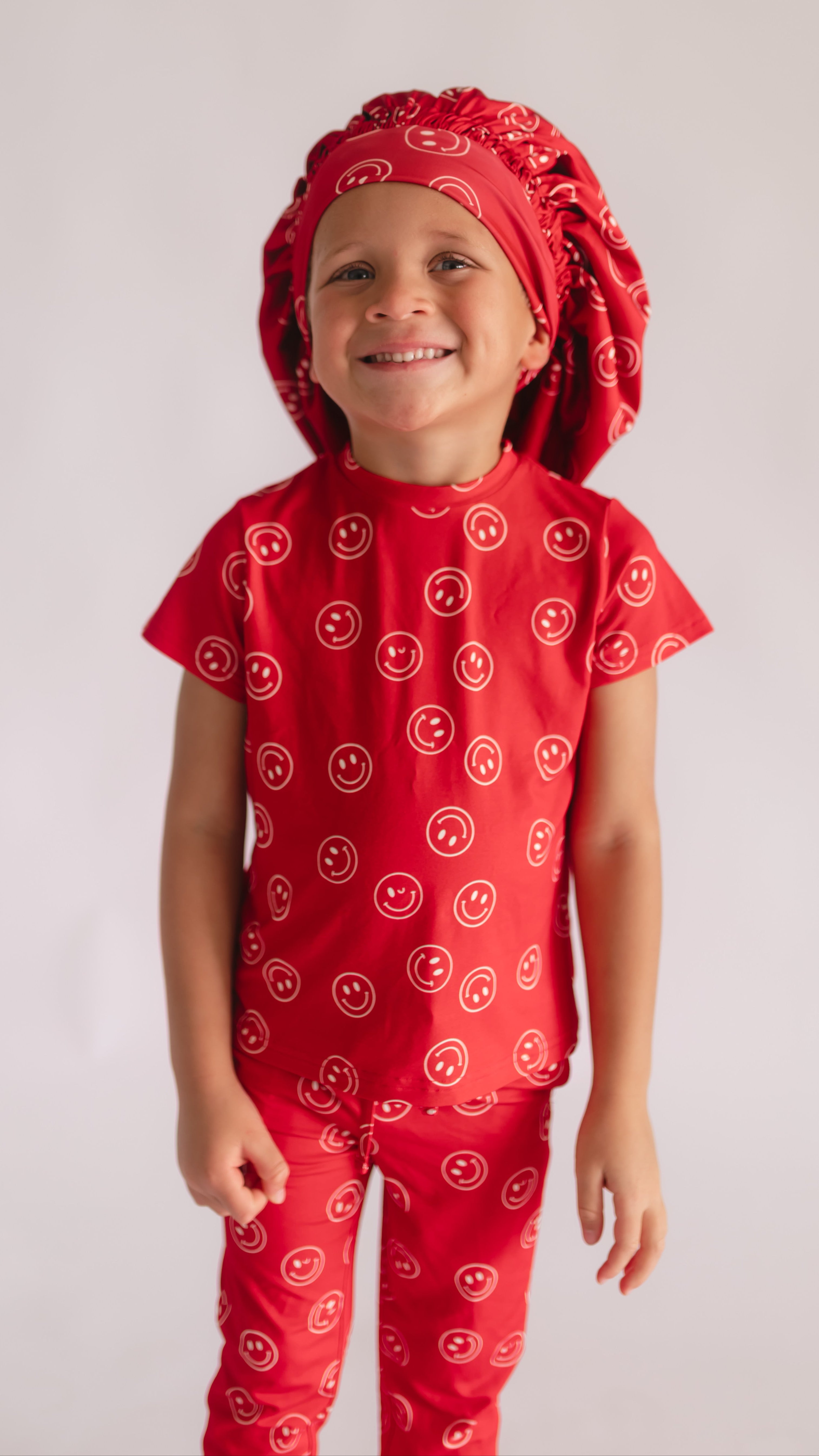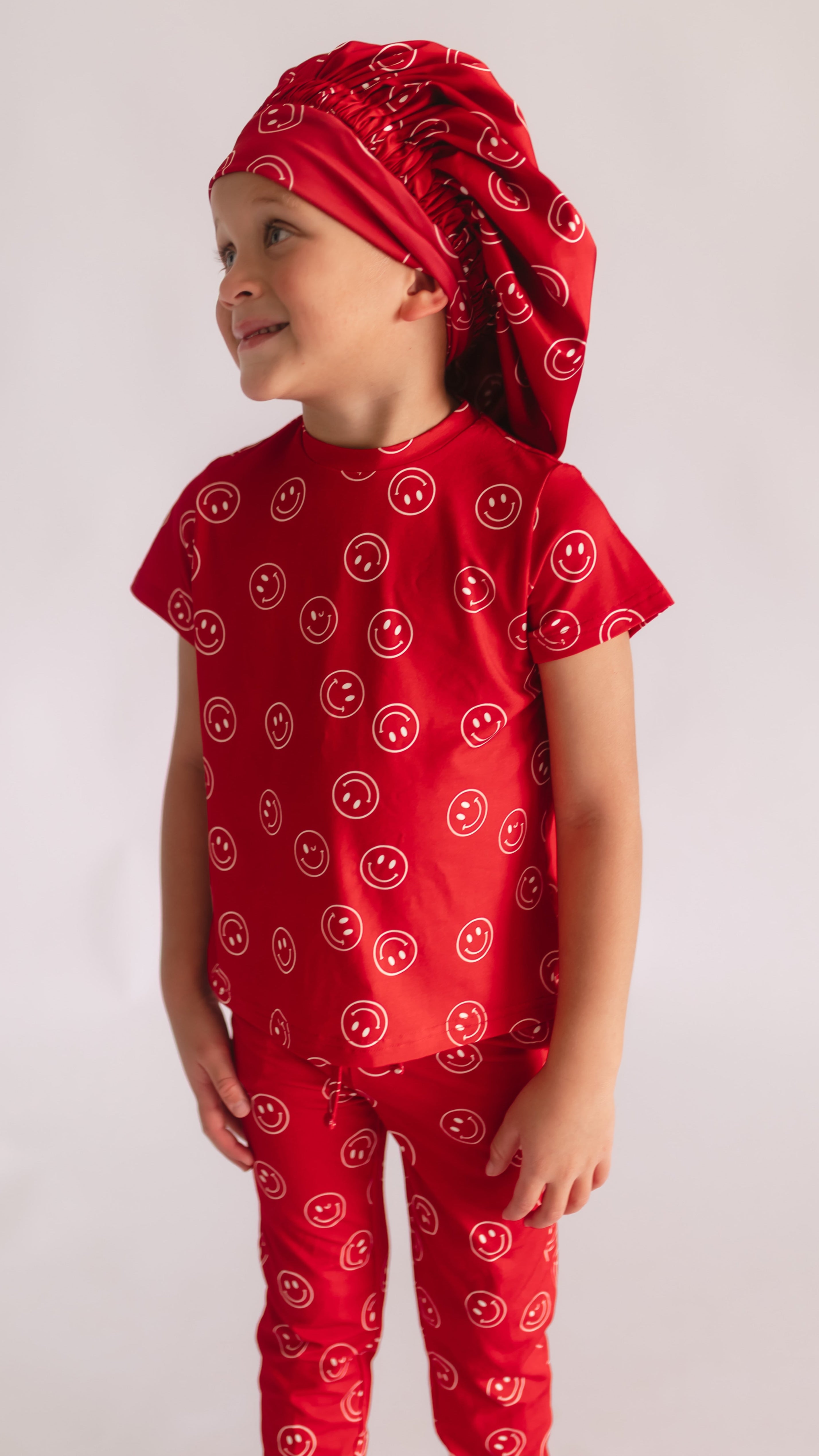 Kids Satin Bonnet in Red Smileys