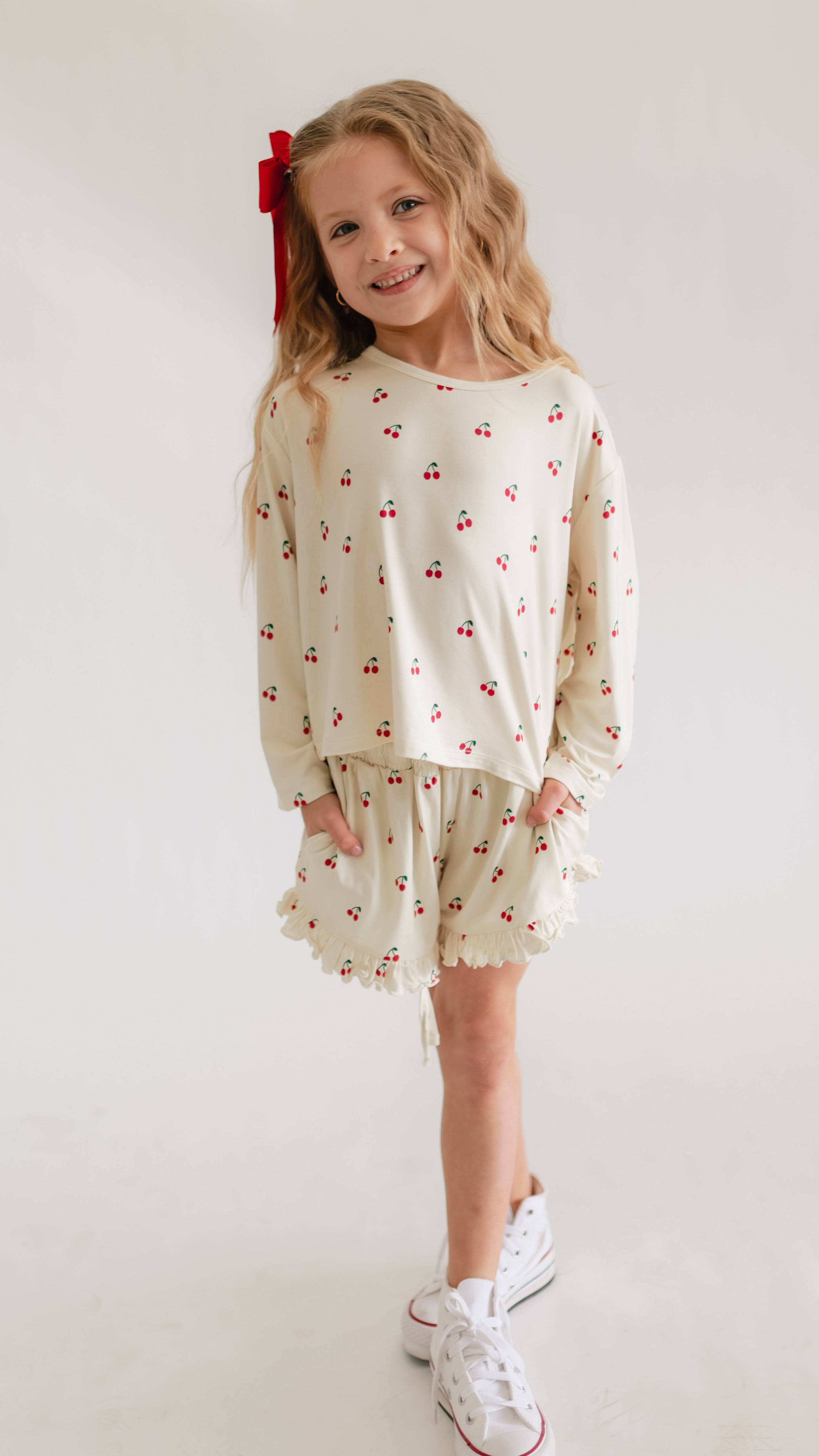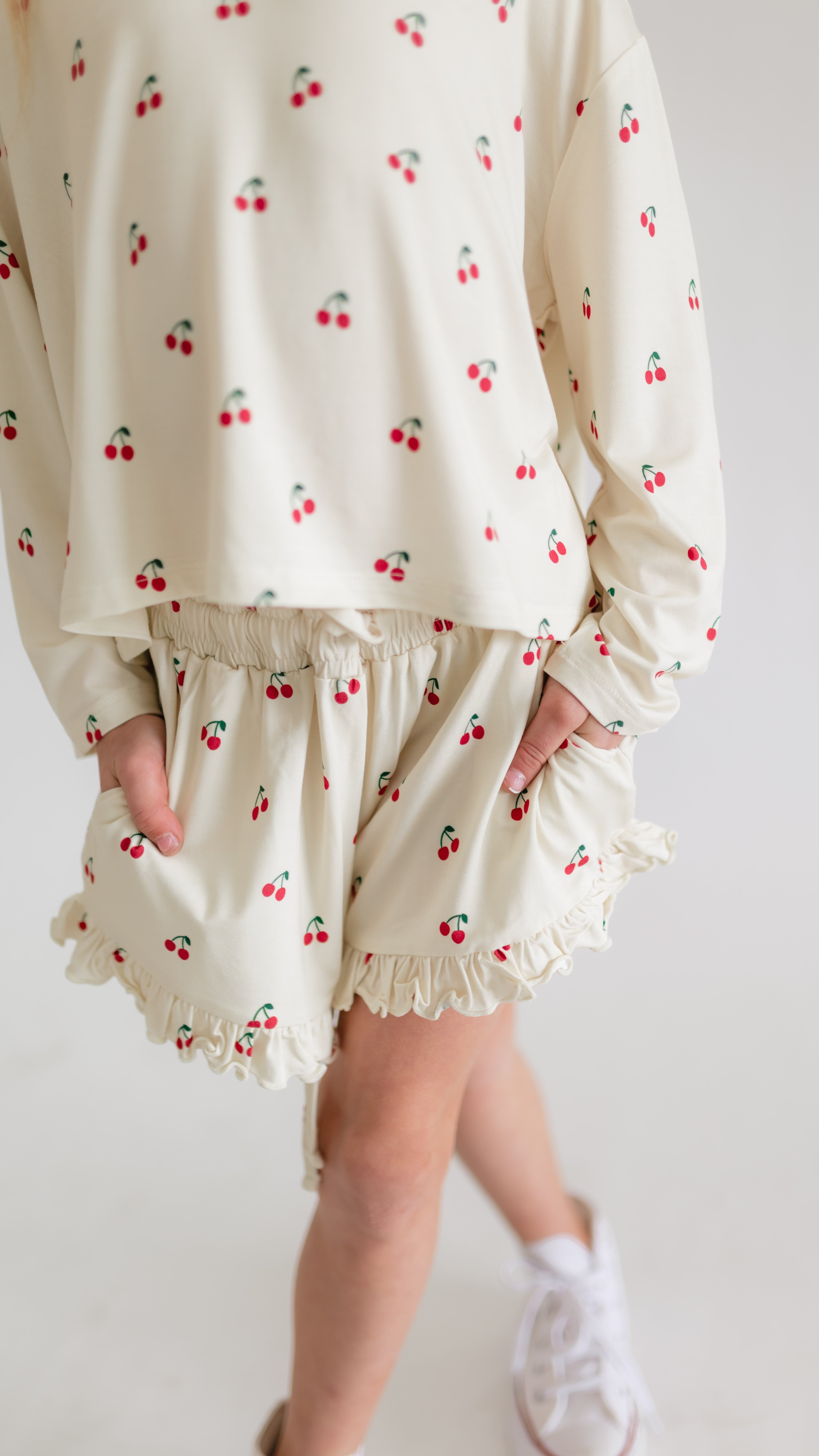 Girl's Long Sleeve and Ruffle Shorts Set in Cream Cherries