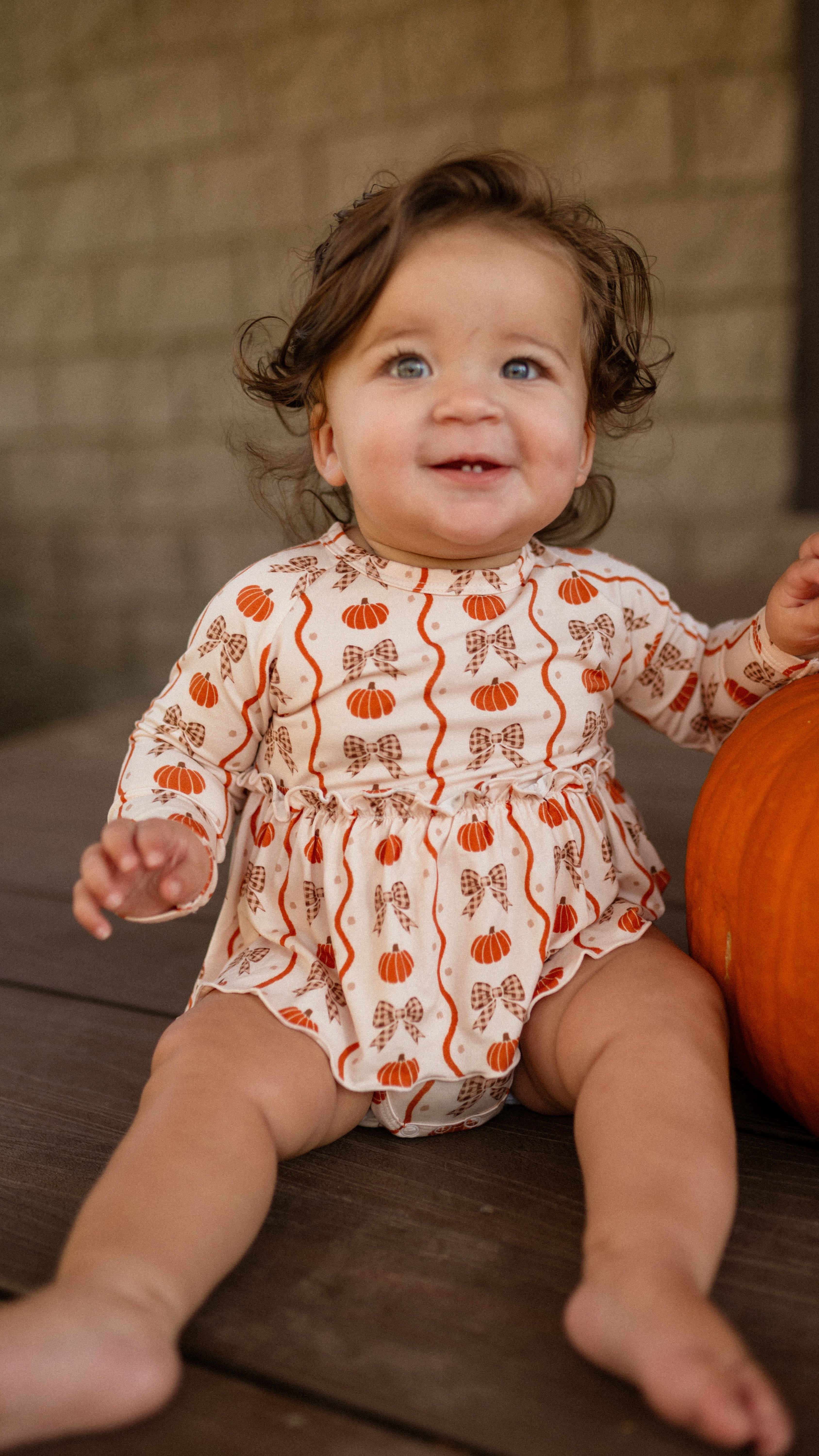 Infant Long Sleeve and Skirt Onesie in Bows and Pumpkins